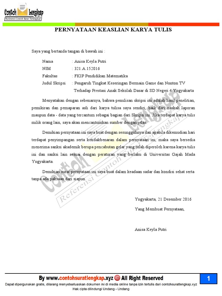 Contoh surat pernyataan keaslian skripsi. Contoh surat pernyataan skripsi di bawah ini merupakan salah satu contoh surat pernyataan yang biasa di gunakan dalam universitas. Surat pernyataan keaslian skripsi aby kembar nota dinas pembimbingpasangan yang mau menikah hendaknya mempunyai persiapan: Preview contoh surat pernyataan keaslian skripsi tugas akhir. Contoh surat pernyataan penelitian perusahaanit also will feature a picture of a kind that could be seen in the gallery of contoh surat pernyataan penelitian perusahaan.