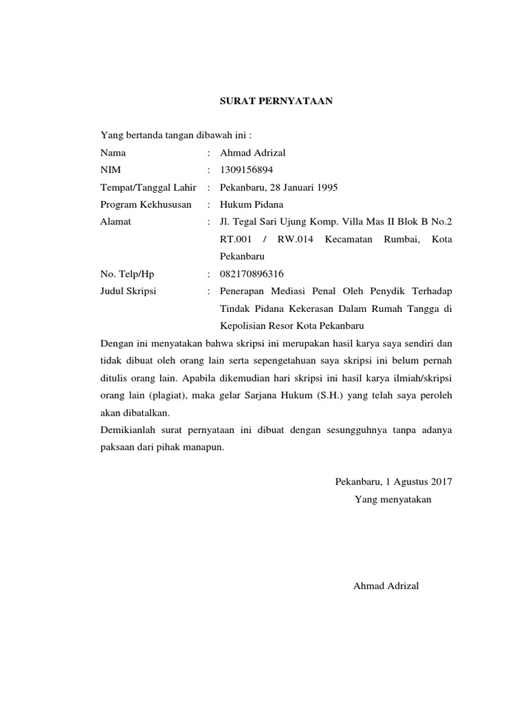 Contoh Surat Pernyataan Skripsi : Surat Keterangan Penelitian. Semoga melalui tulisan ini bisa memberikan wawasan serta membantu pembaca sekalian. Surat pernyataan ini biasanya terdapat pada skripsi sebagai tanda pernyataan bahwa skripsi yang dibuat ada hasil karya sendiri bukan dari plagiat karya orang lain. Contoh surat pernyataan penelitian perusahaanhave a graphic associated with the other. Sedang melakukan perjanjian kesanggupan dengan pihak lain, namun bingung formatnya seperti apa? Raya lubuk begalung, sumatera barat telephon :